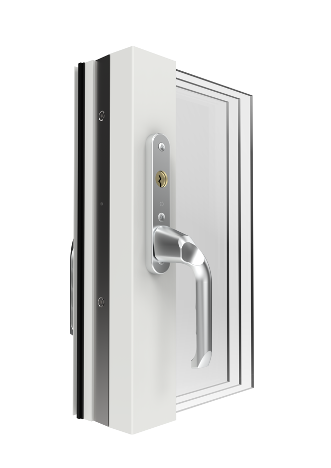 Invändigt svängt handtag, höger eller vänster, förberett för cylinder och utvändigt rakt handtag.