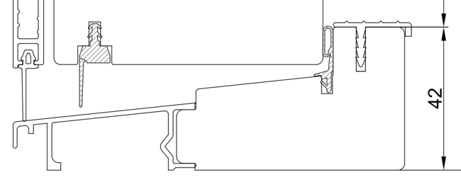 Harmoni 2+1 utåtgående fönsterdörr erbjuds med tre tröskelalternativ, här visas den högsta varianten. Tröskel i trä med utvändig del av aluminium, höjd 42 mm.
