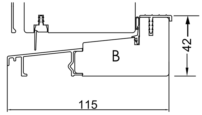 Original Alu Altan- och Fönsterdörr erbjuds med tre tröskelalternativ, här visas den högsta varianten. Tröskel i trä med utvändig del av aluminium, höjd 42 mm.